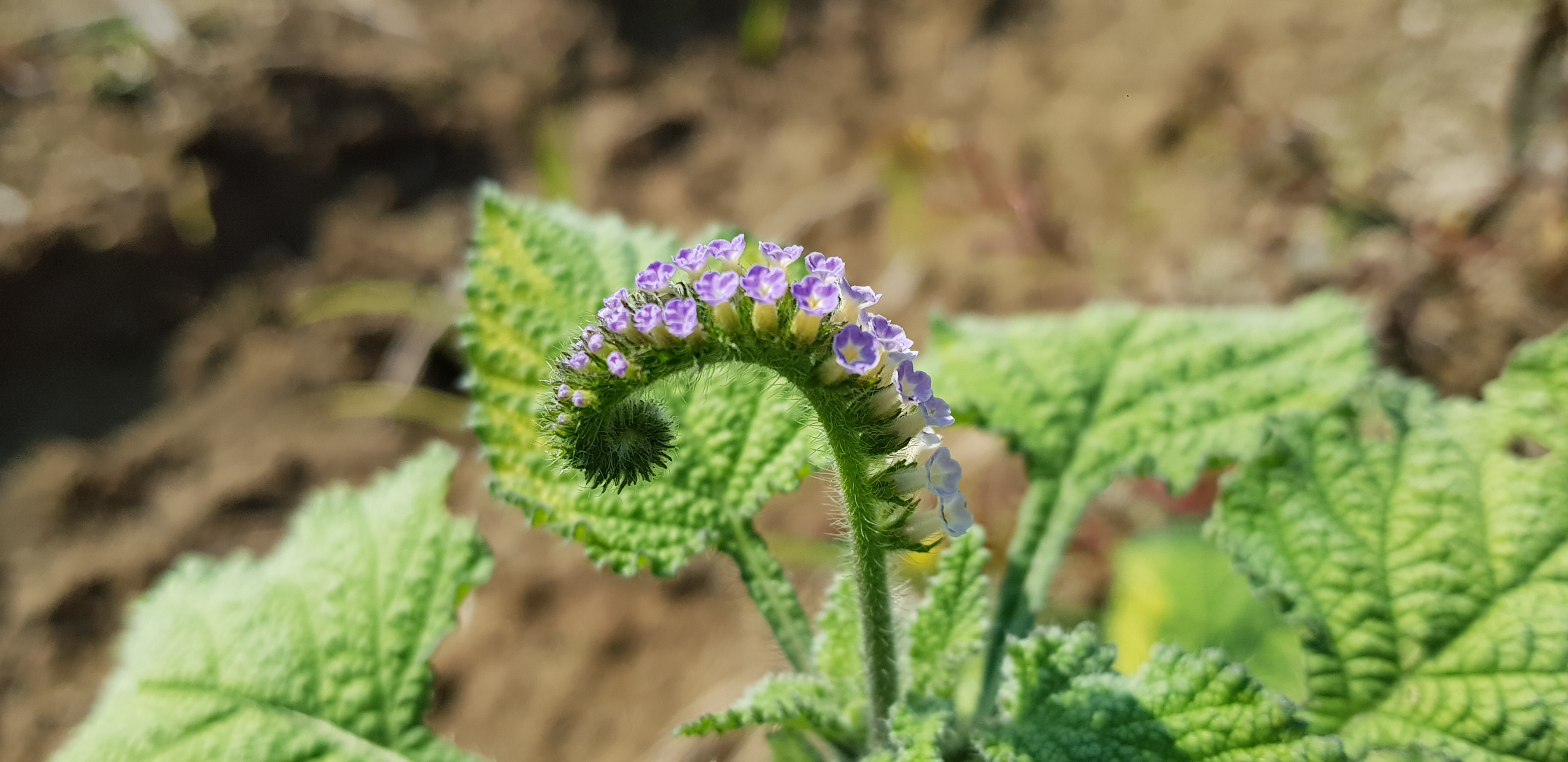 ลำต้น มีลักษณะอวบน้ำ ตามลำต้นอาจจะเห็นเป็นร่องมีขนสีขาวปกคลุม โดยเฉพาะบริเวณยอดอ่อน จะมีขนขึ้นปกคลุมหนาแน่นสูงประมาณ 20-70 ซม.ใบ เป็นใบเดี่ยว ขอบใบเรียบเนื้อใบหยาบ มีขนแข็งปกคลุม เรียงตัวแบบสลับ ดอก แบบช่อกระจุก (cyme) จะม้วนโค้งอายุยังน้อย ดอกย่อยมีรูปทรงไม่สมมาตร มีทั้งสองเพศ มีขอบวงแหวนรอบรับรังไข่ ผล แบบผลแห้ง (capsule) ผลเปลือกแข็งเมล็ดเดียว (nut) หรือผลเมล็ดเดียวแข็ง (drupe)