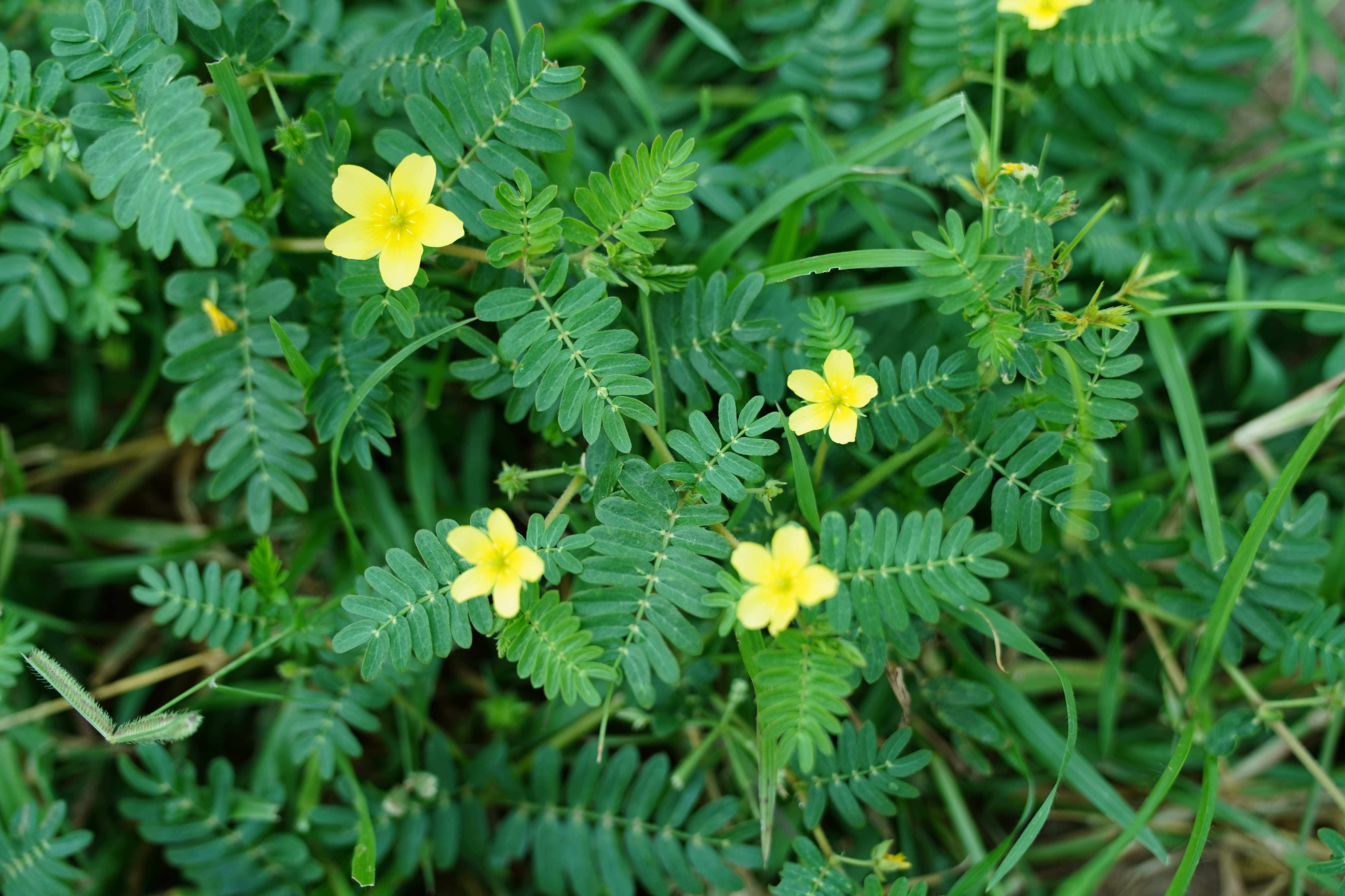 ลำต้น ทอดเลื้อยไปตามพื้นดินแตกกิ่งก้านออกโดยรอบ แต่จะชูส่วนปลายยอดและดอกขึ้นมามีขนปกคลุมทั่วลำต้น ใบ เป็นใบประกอบแบบแขนง ประกอบไปด้วยใบย่อยขนาด 6-7 คู่ ใบข้างหนึ่งมักโตกว่าใบอีกข้างหนึ่งเสมอ ด้านหลังใบมีขนยาวปกคลุม ดอก ป็นดอกเดี่ยวที่มีก้านดอกยาว ดอกมีขนาดเล็ก กลีบดอกสีเหลืองสดใส ประกอบไปด้วย กลีบ ดอก 5 กลีบ กลีบเลี้ยง 5 กลีบ ดอกออกตามข้อ ผล แบบผลแห้งแตก (capsule) ลักษณะกลม เปลือกผลเป็นรูปห้าเหลี่ยม แก่แล้วแตกเป็น 5 ซีก แต่ละซีกมีหนามแข็งยาว 1 คู่ สั้น 1 คู่ แต่ละผลประกอบด้วย 4-5 เมล็ด
