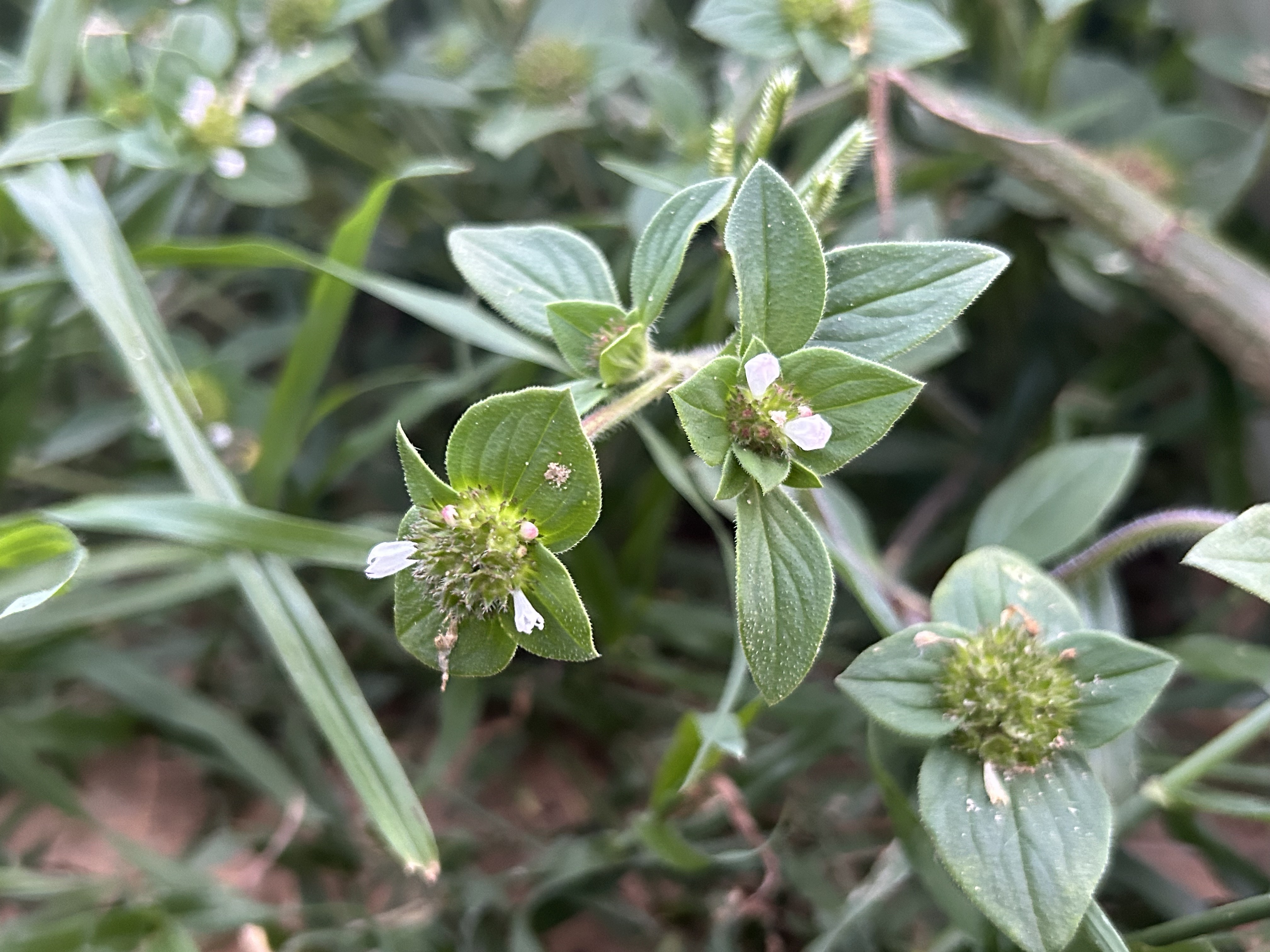 วัชพืชอายุฤดูเดียว ลำต้นเลื้อยทอดนอน แผ่ไปตามพื้นดิน ลำต้นยาวได้ถึง 40 เซนติเมตร มีขนปกคลุมหนาแน่น ต้นอ่อนใบเลี้ยงรูปไข่หรือรูปรี โคนใบมนและปลายใบตัด ขอบใบเรียบ ใบจริงรูปรี โคนใบมนและปลายใบแหลม ขอบใบเรียบ เกิดเป็นคู่ตรงข้ามกันตามข้อลำต้น มีขนปกคลุม มักมีขนสั้นปกคลุมด้านบนและบนขอบและเส้นใบด้านล่าง ดอกมีขนาดเล็กสีขาว ออกเป็นกระจุกอัดแน่นรองรับด้วยใบประดับ 4 ใบ เมล็ดรูปกระสวยปลายทั้งสองด้านสอบเข้าหากันเล็กน้อย และโค้งมน ด้านหนึ่งมีร่องตรงกลางตามยาวของเมล็ด เมล็ดสีน้ำตาลเข้ม (จันทร์เพ็ญ, 2551; จันทร์เพ็ญและคณะ, 2553; จรรยาและคณะ 2559; จรัญญา, 2561)