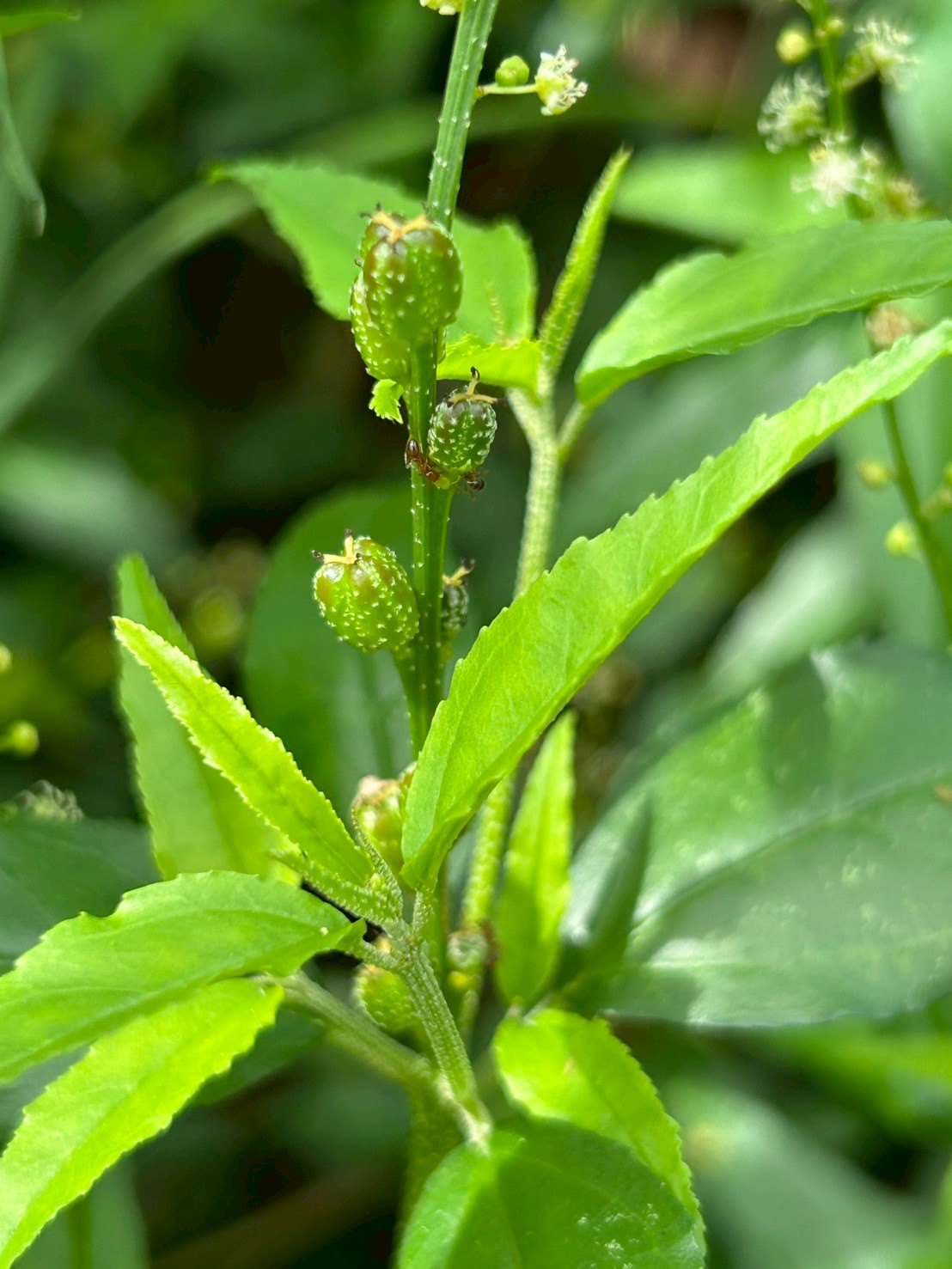 ลำต้น ไม้พุ่มขนาดเล็ก สูง 30-40ซม. แตกกิ่งก้านมาก ลำต้นและใบมีขนรูปดาวปกคลุม ใบ เป็นใบเดี่ยว เรียงเวียน รูปขอบขนาน กว้าง 0.5-1 ซม. ยาว 1-5 ซม. ปลายใบแหลม โคนใบสอบ ขอบใบหยักฟันเลื้อย ดอก ดอกคล้ายแบบช่อกระจะดอกแยกเพศบนช่อเดียวกัน ดอกเพศผู้ด้านบน ดอกเพศเมียอยู่ด้านล่าง กลีบเลี้ยง 5 กลีบ ดอก 5 กลีบ สีขาว เกสรเผศผู้จำนวนมาก ผล แห้งแตก รูปรี เมล็ด 3 เมล็ด สีเทาหรือดำ